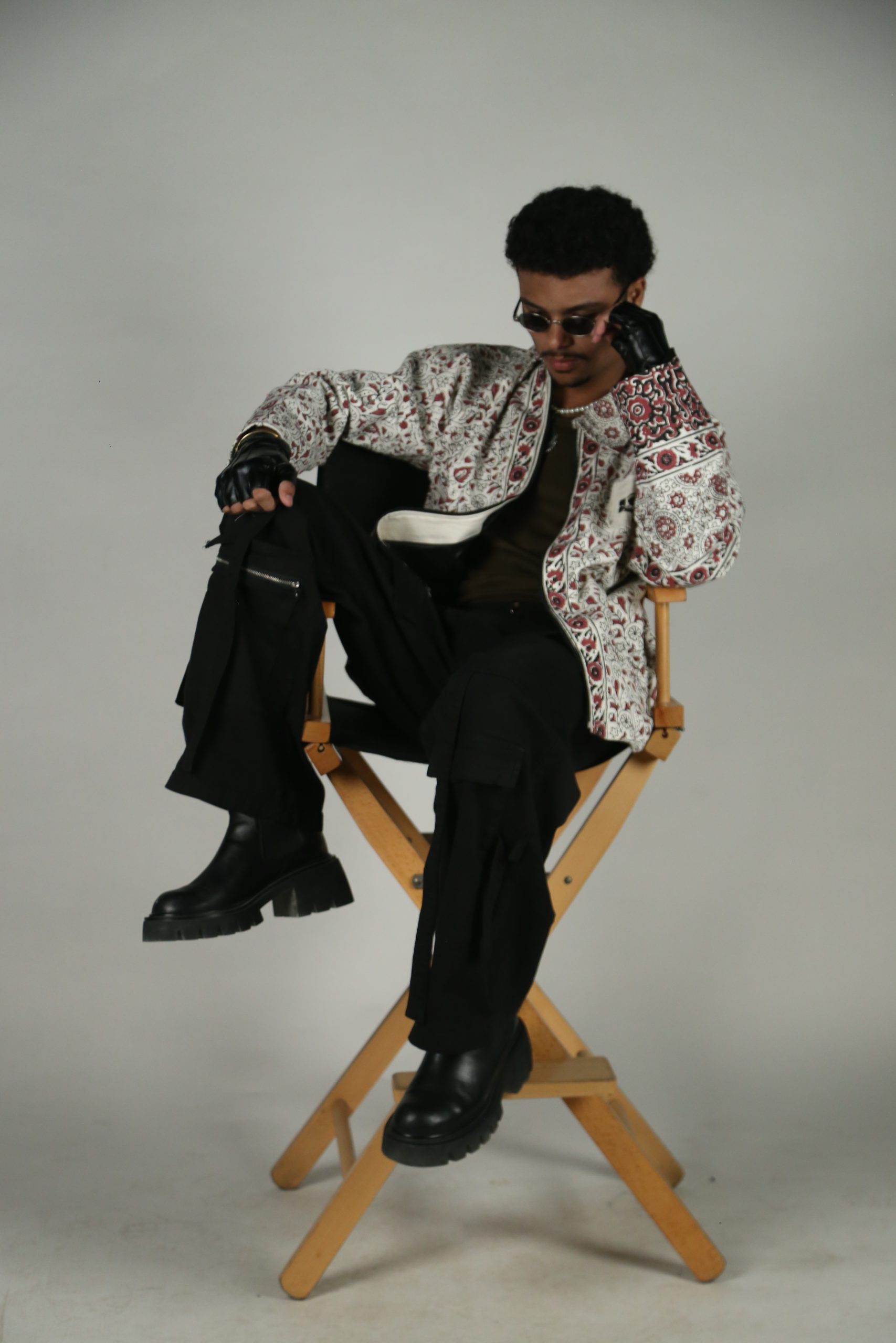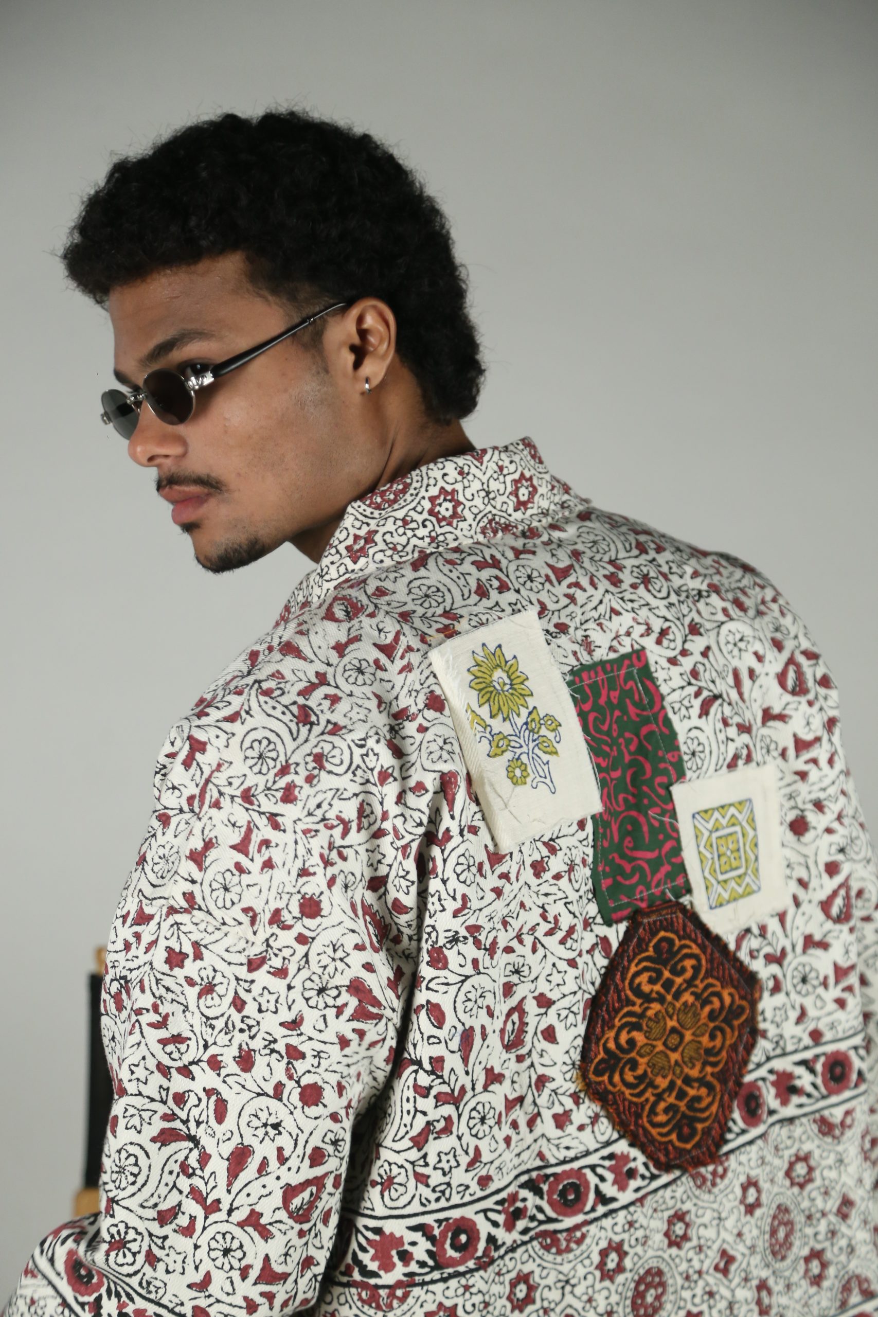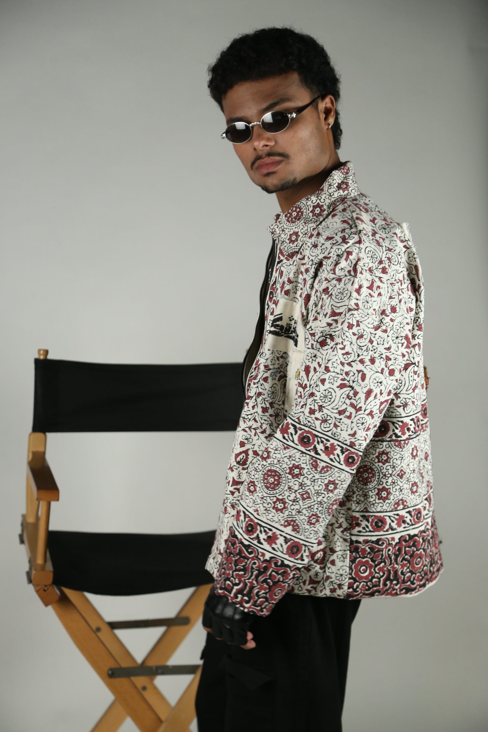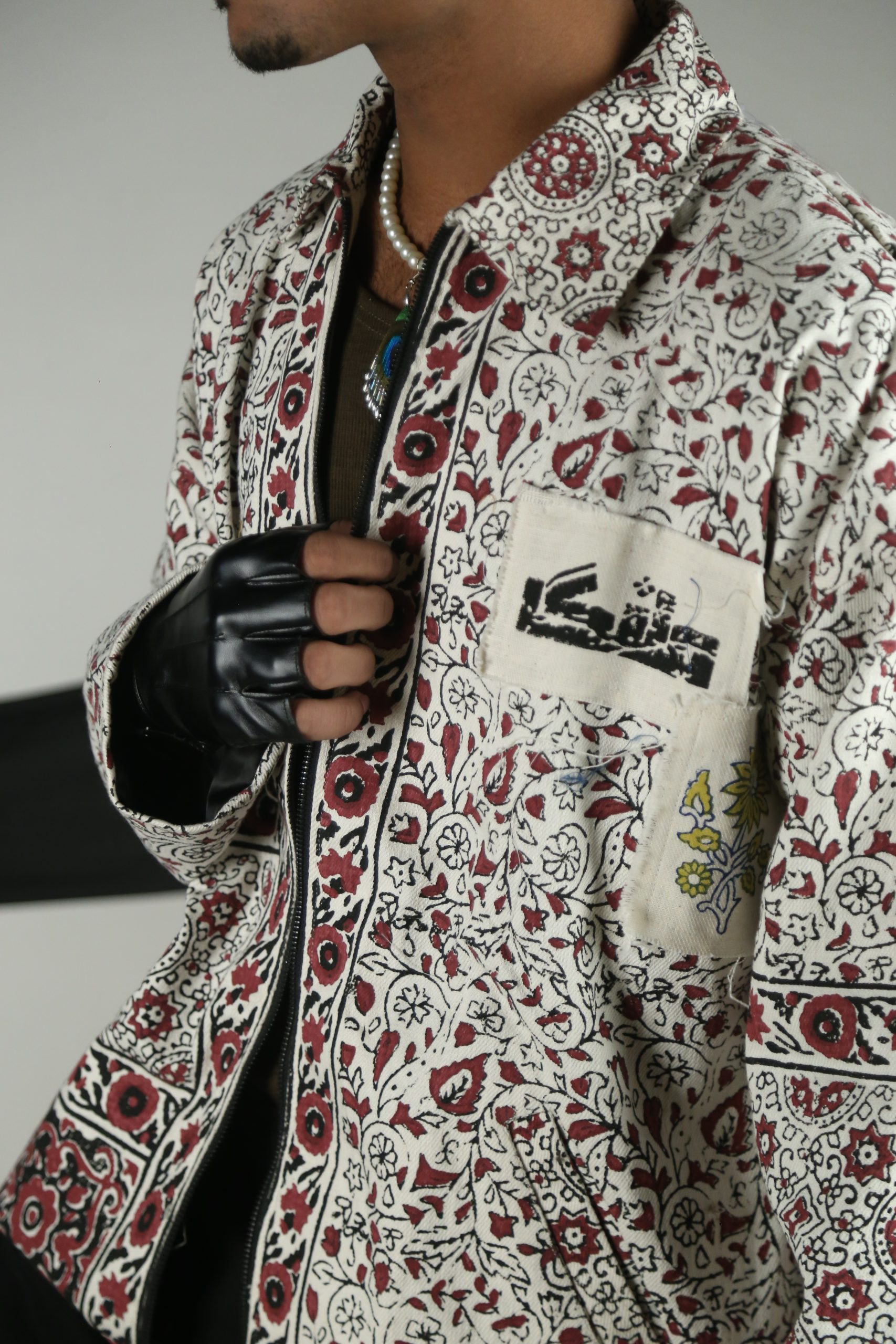Chaap-o-Paiwand is a study in craft collision: ajrak-style jaal, block-printed motifs, and stitched patches layered on a canvas body. A front zipper and warm lining make it practical, while the all-over work makes it ceremonial — a garment fit for both protest and poetry nights.