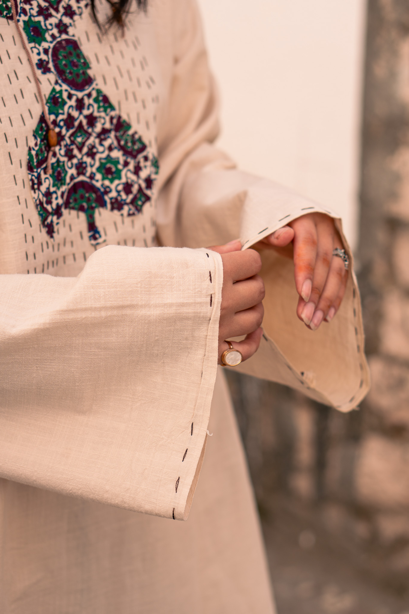 The blockprinted stencil cut at the front forms the core of the piece — centered, composed.